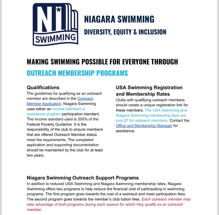 We would like to remind you of the ways Niagara Swimming can help support (financially) our outreach athletes. Please reference this Outreach Program Summary, found at the link.