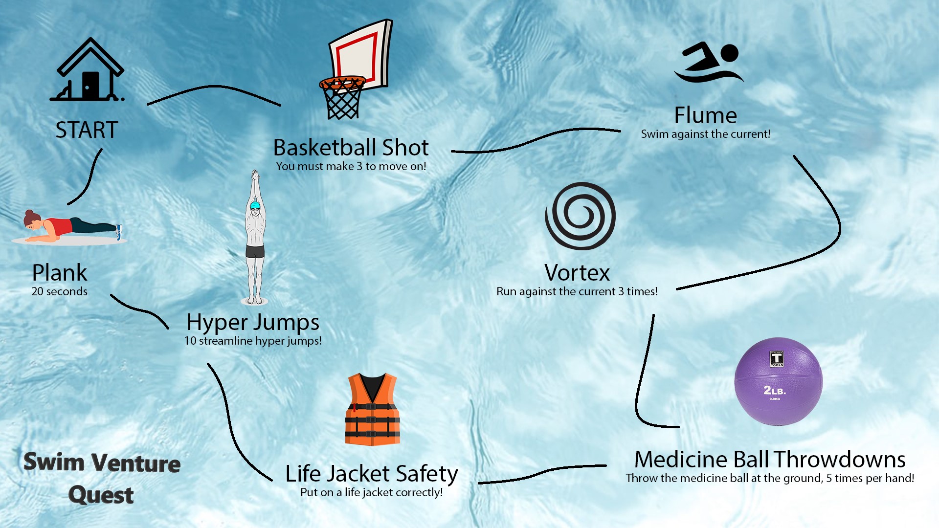 Activities included the Swim Venture Quest, creating your own swim meet (pictured below to the left), vertical kicking and starts, turns and finishes to name a few. The swimmers' evaluations revealed the overwhelming favorite activity was the SWIM VENTURE QUEST coming in at 80%.